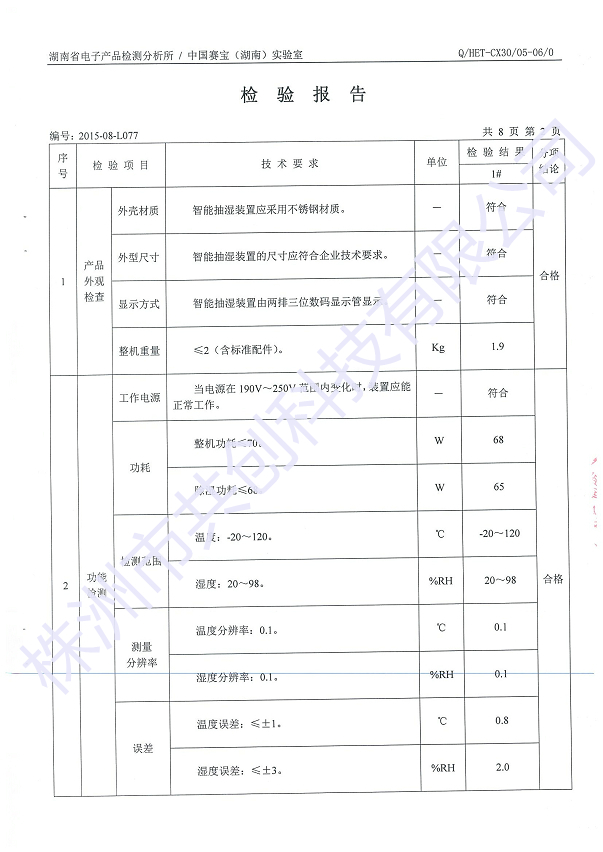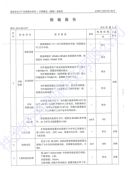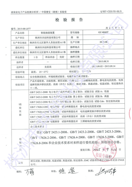 我公司針對GC-8030T的除濕效果做了相關實驗,把GC-8030T放在一個1.5立方米的密封箱體內,開啟手動除濕功能,3個小時候后,濕度由原來的75.6%RH降到了51.2%RH左右;溫度由原來的25.1度上升到32.7度。實驗結果,濕度下降了24.4%RH,溫度只上升了7.6度,;實驗結果表明:使用GC-8030T可全部解決箱體內的驅潮問題,而且很大除濕功率只有60W。